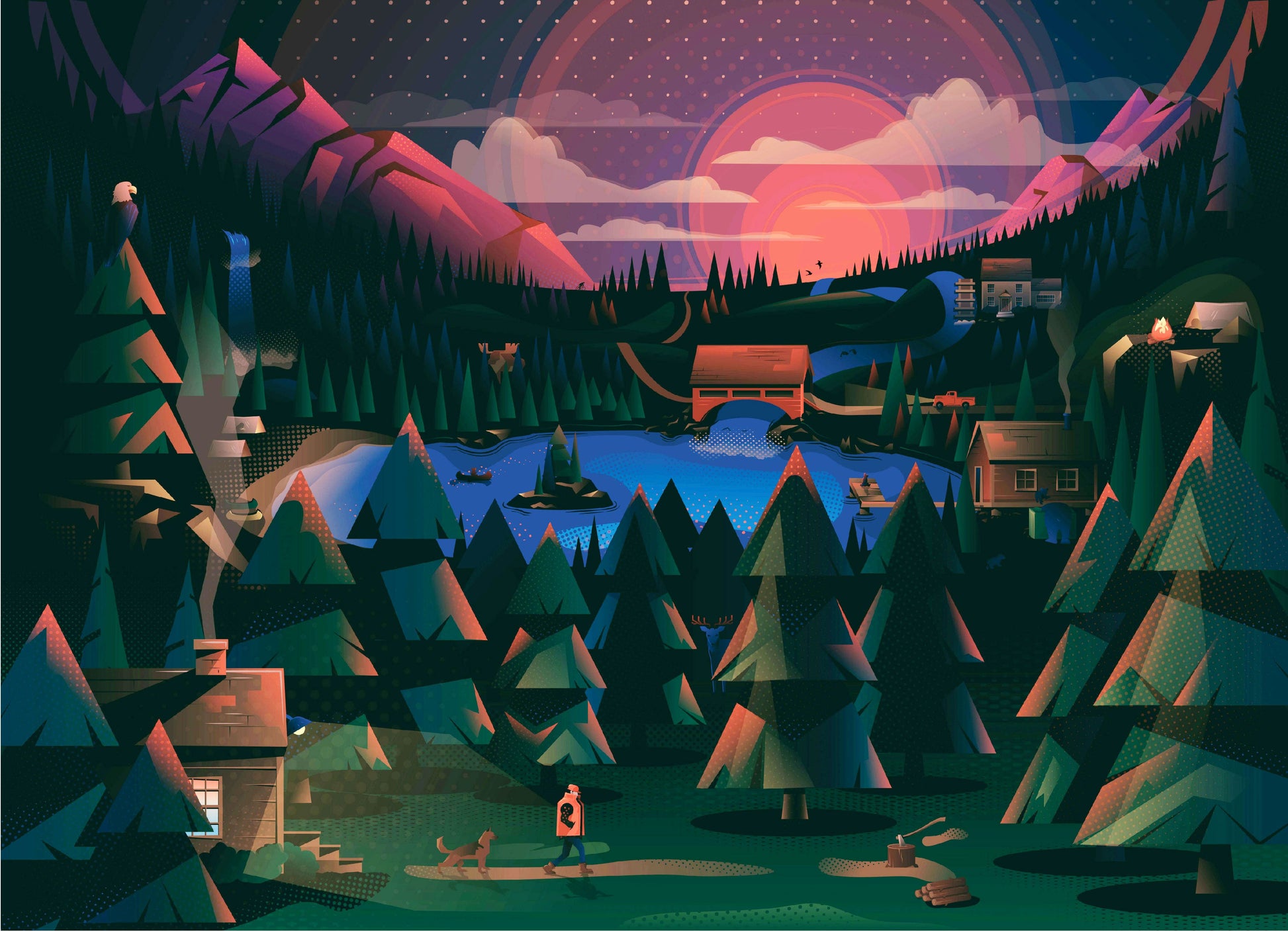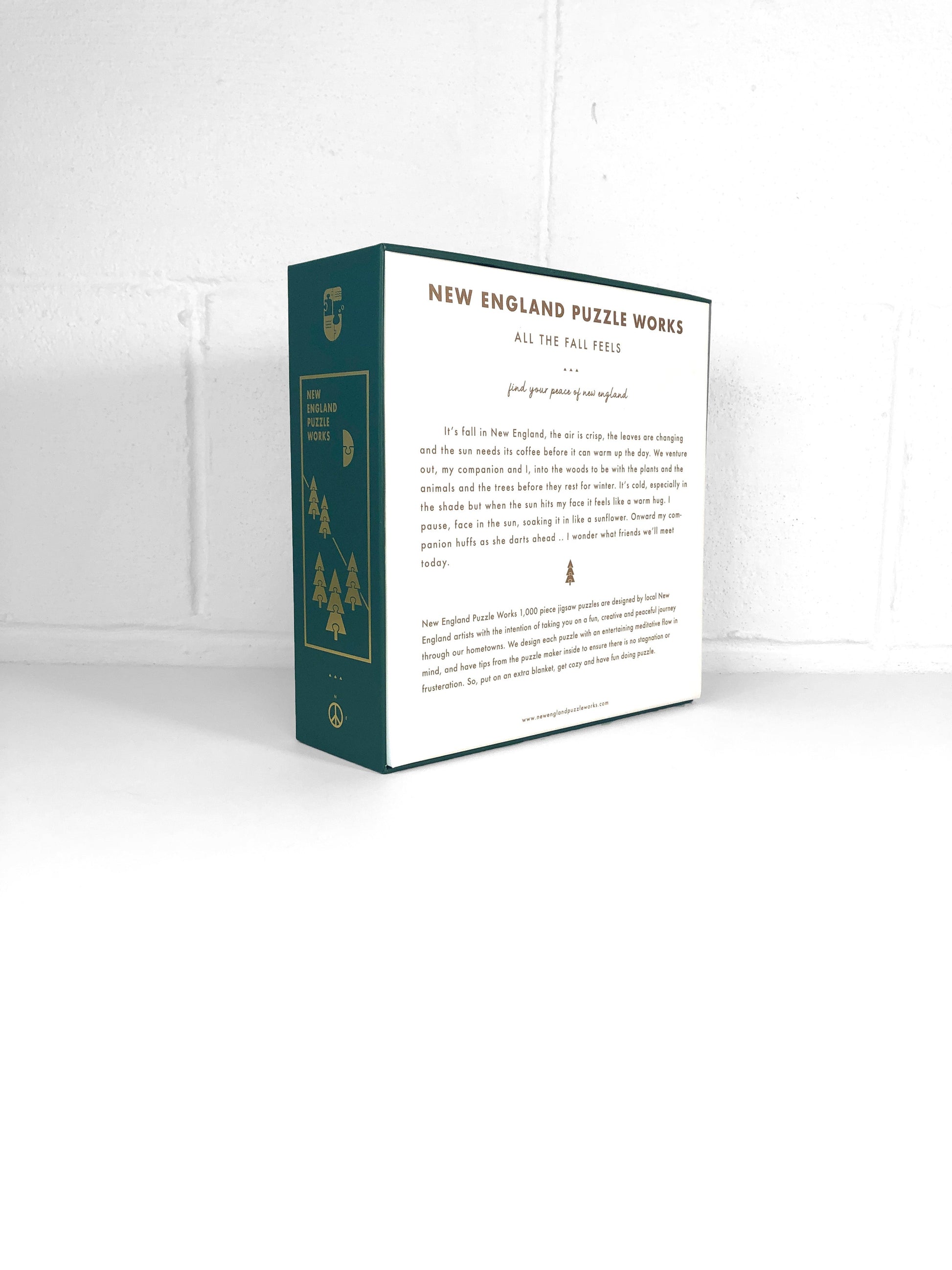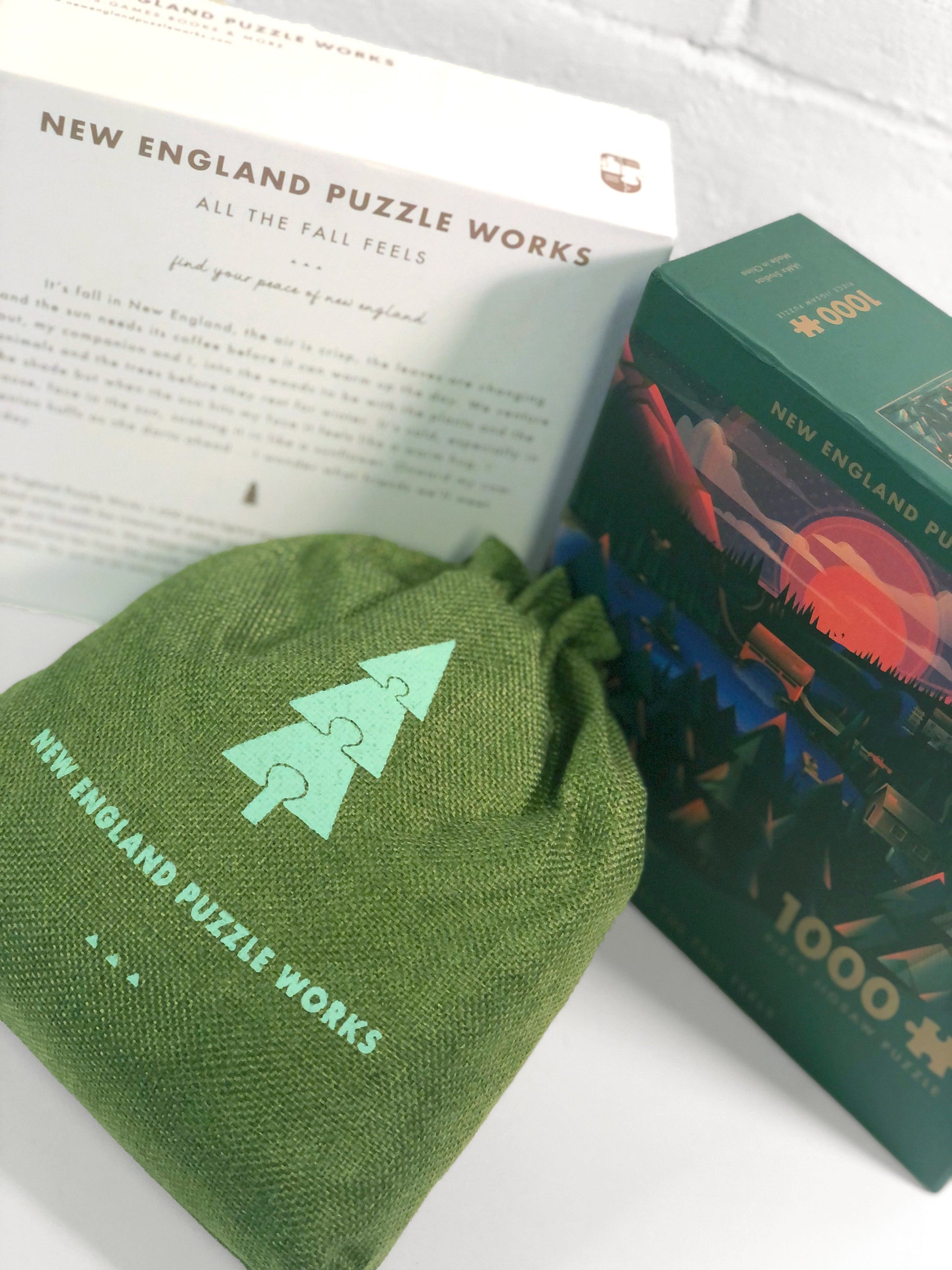 New England Puzzle Works - All The Fall Feels. 1000 piece jigsaw puzzle with custom die cut pieces, made from recycled chipboard. Take a stroll through the woods of New England on a crisp Fall morning and see how many friends you meet with this custom designed, nature inspired puzzle.