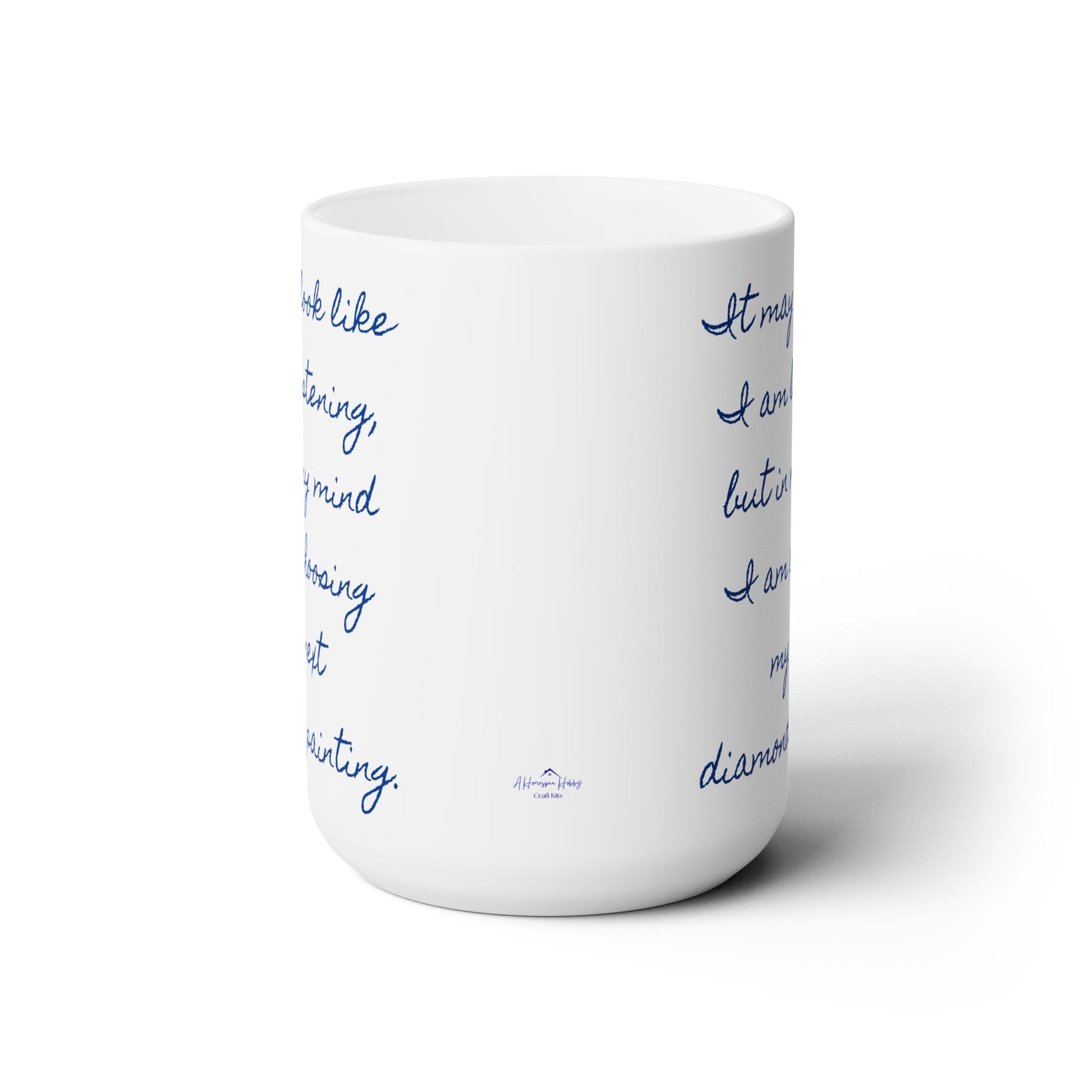This mug may look like your average white ceramic wonder, but don't be fooled – it's a portal to a realm where diamonds reign supreme! In a stylish navy blue font, proudly proclaim to the world, "I may look like I am listening, but in my mind, I am choosing my next diamond painting."