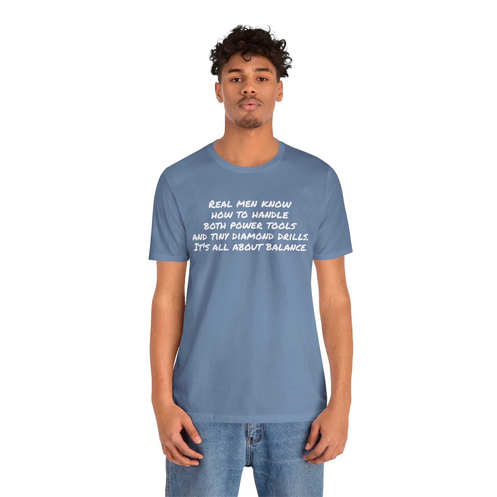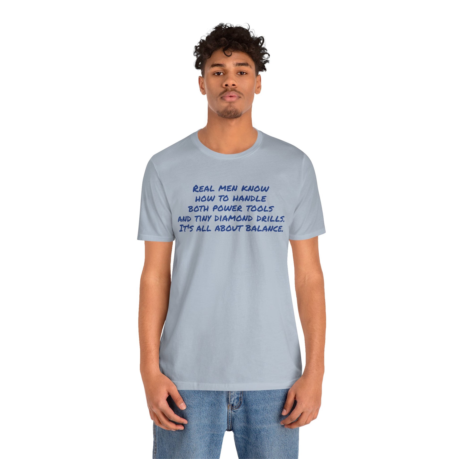 Real men know how to handle both power tools and tiny diamond drills – it's all about balance. A funny diamond painting t-shirt for the diamond painting guy in your life.