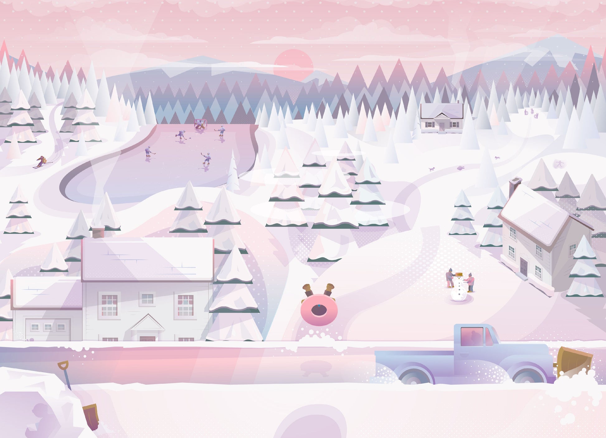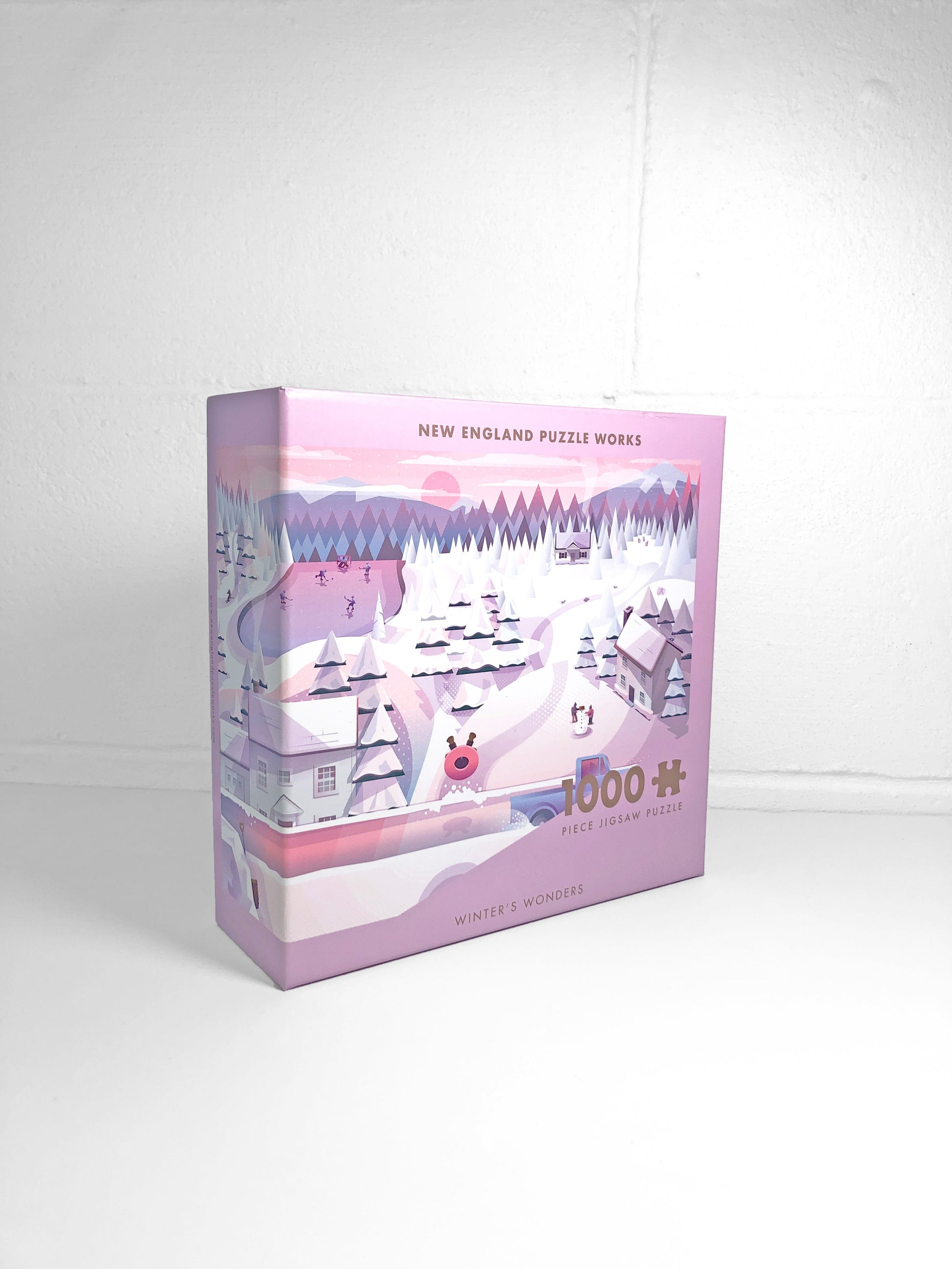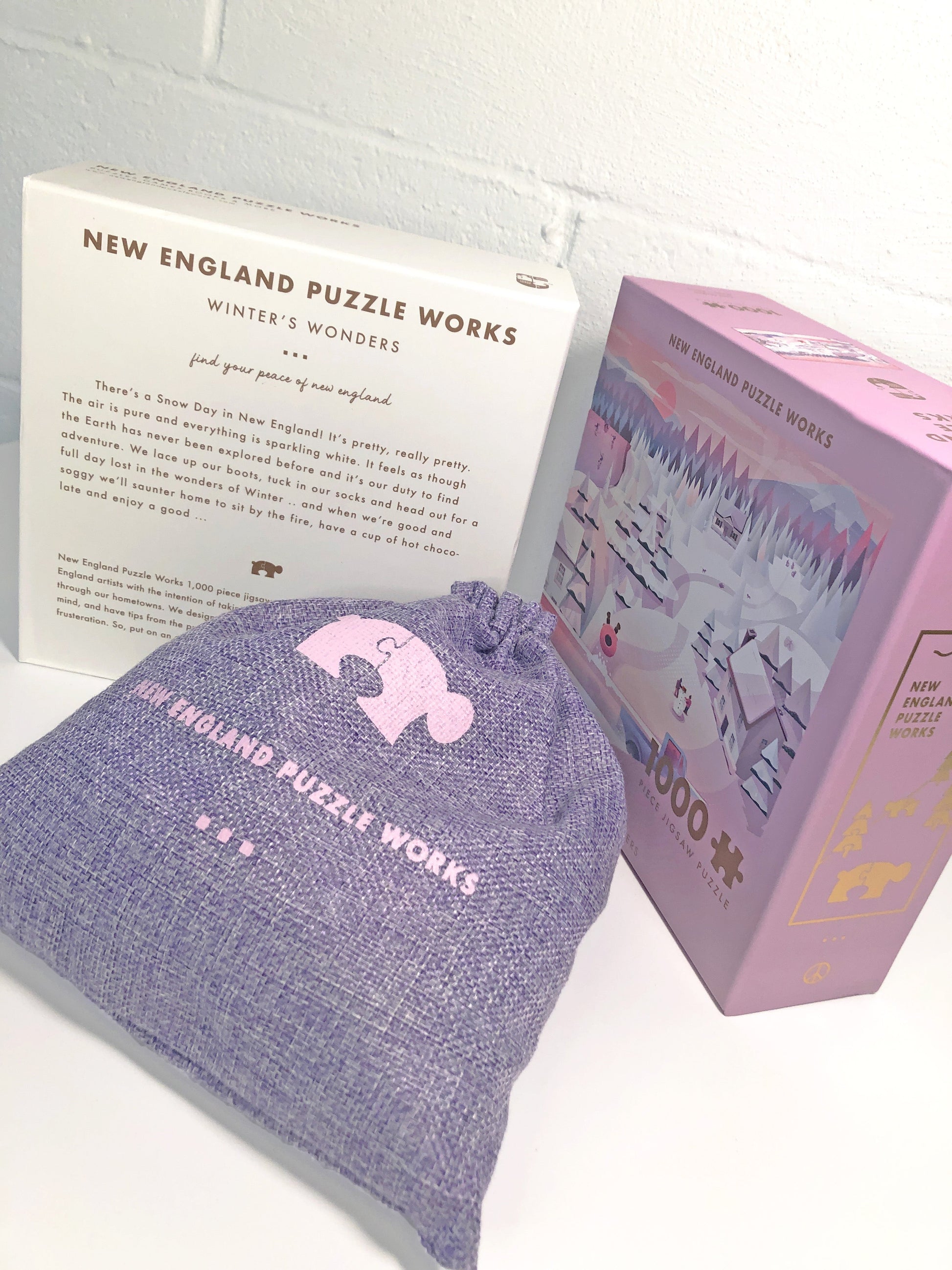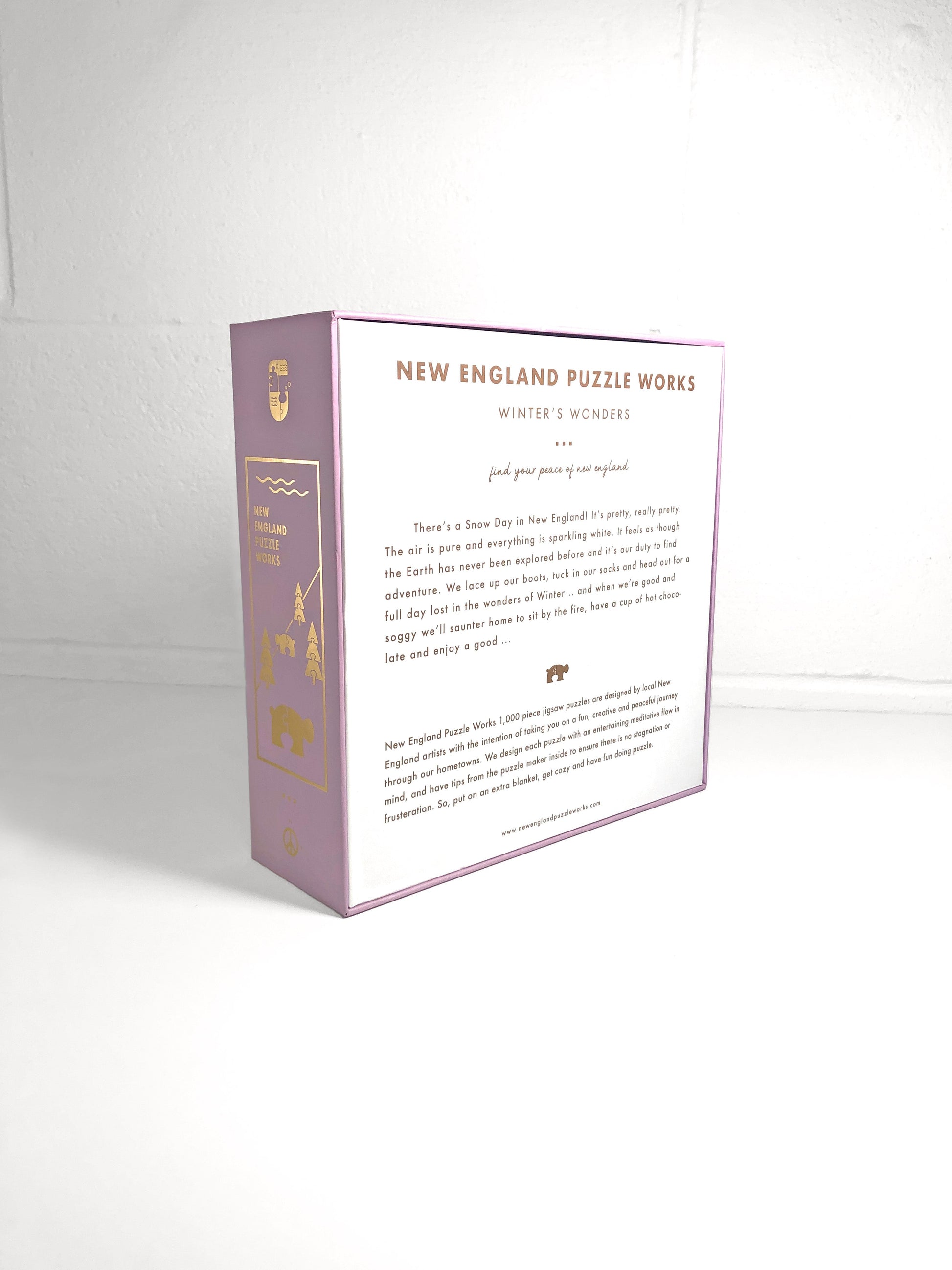 New England Puzzle Works - Winter's Wonders. 1000 piece jigsaw puzzle with custom die cut pieces, made from recycled chipboard. It's a snow day in New England! Get outside and find adventure in the wonders of Winter with this custom designed, nature inspired puzzle.